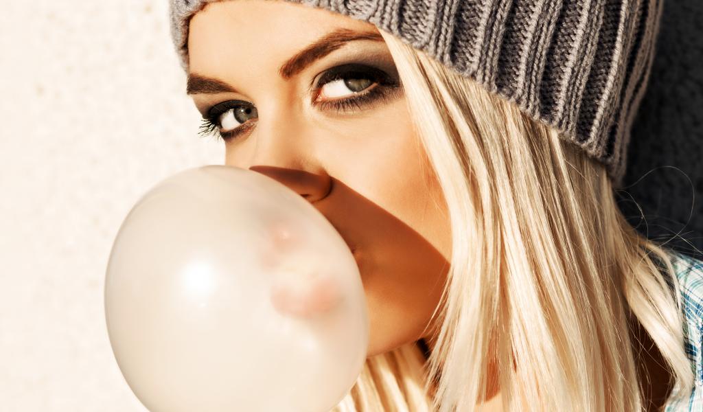 Wallpaper Blonde girl with chewing gum in mouth close-up