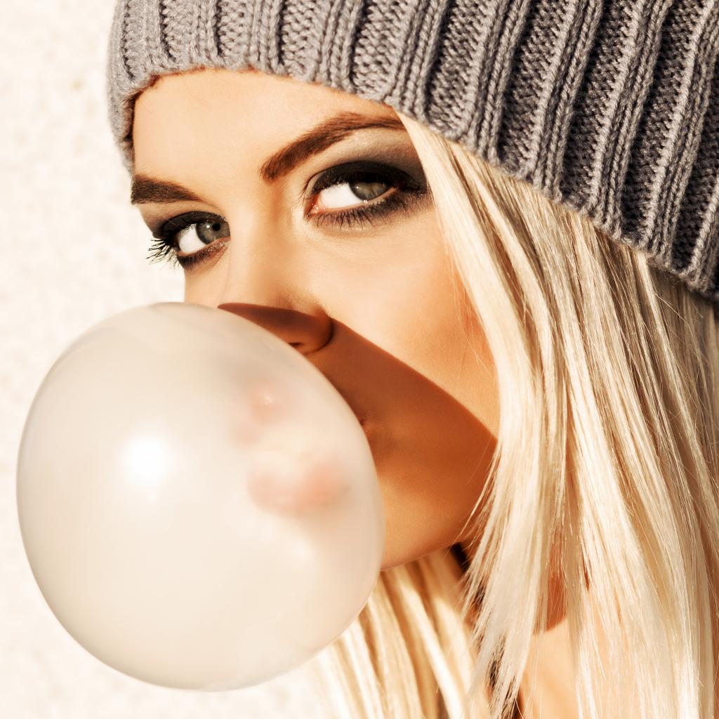 Wallpaper Blonde girl with chewing gum in mouth close-up