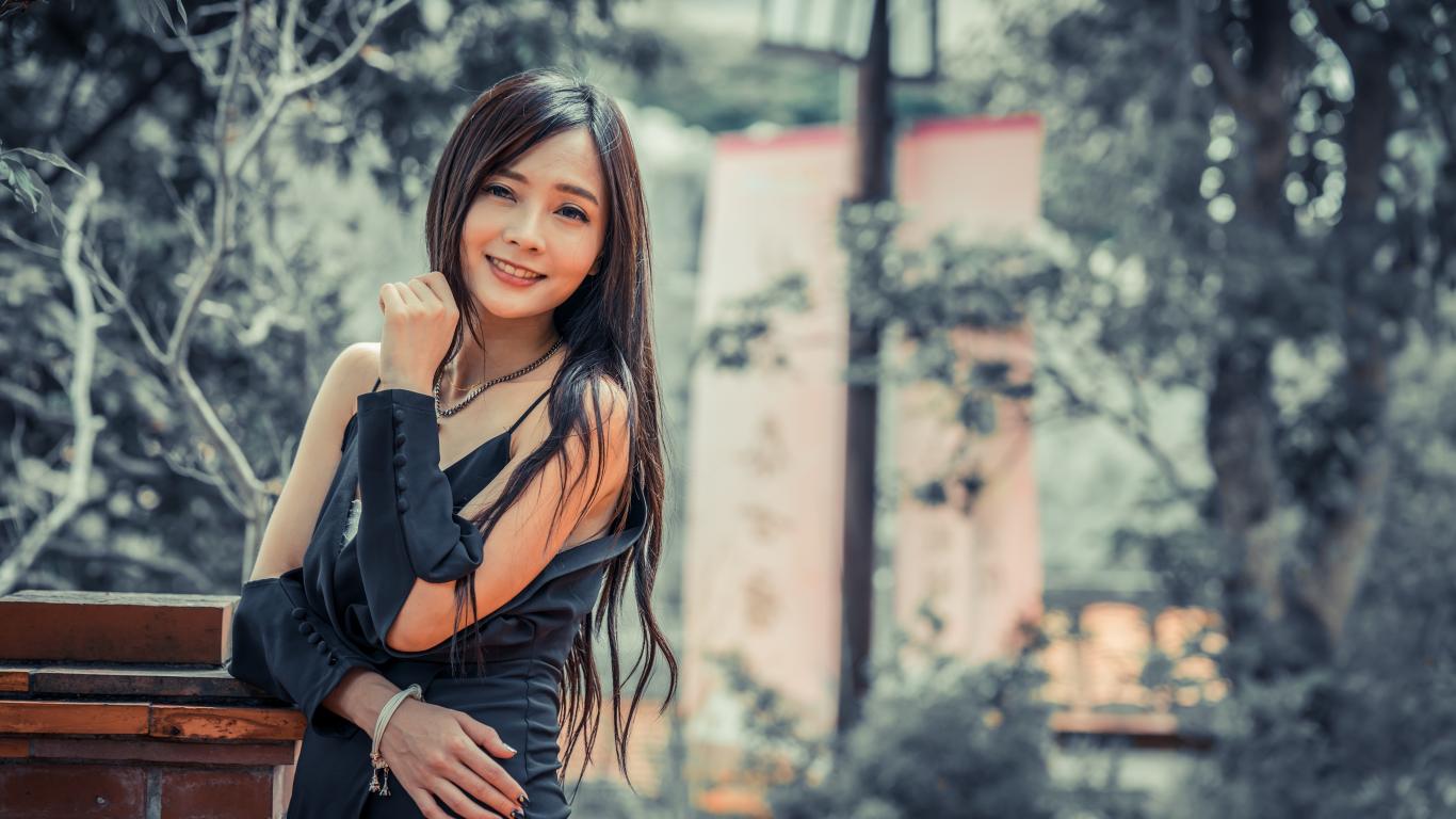 » Wallpaper Smiling Asian girl in black dress