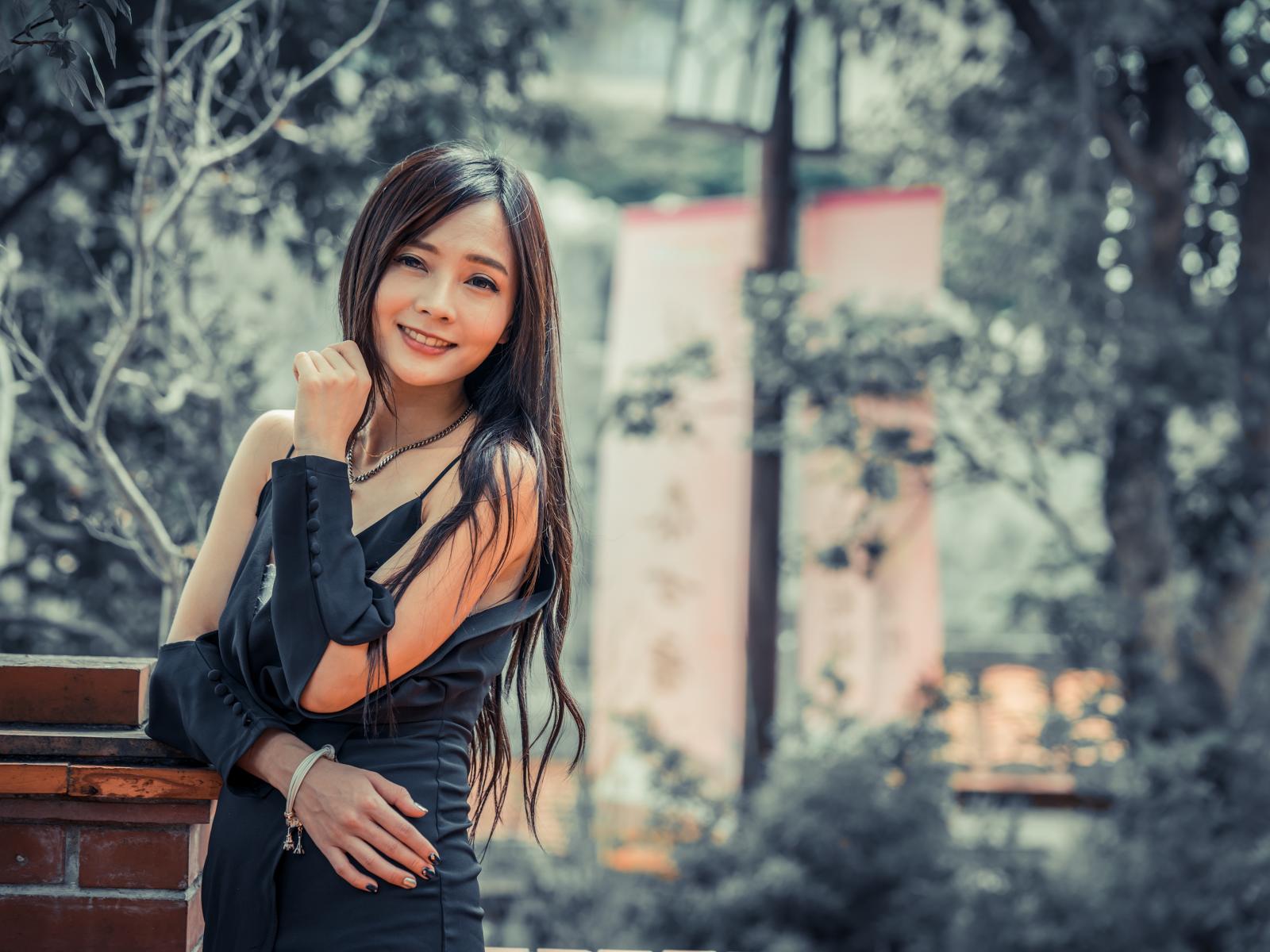 Wallpaper Beautiful Asian girl in a black dress sits on a wooden bench