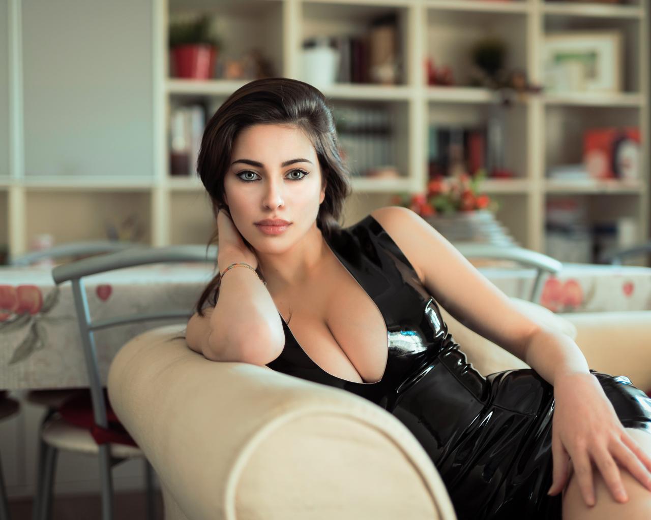 Wallpaper Stylish fashion girl in black dress on the sofa