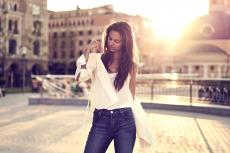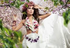 Wallpaper A beautiful girl stands on the background of a flowering bush