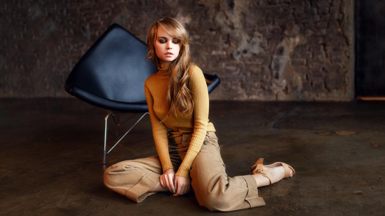 Wallpaper The girl is sitting on the floor near the black chair