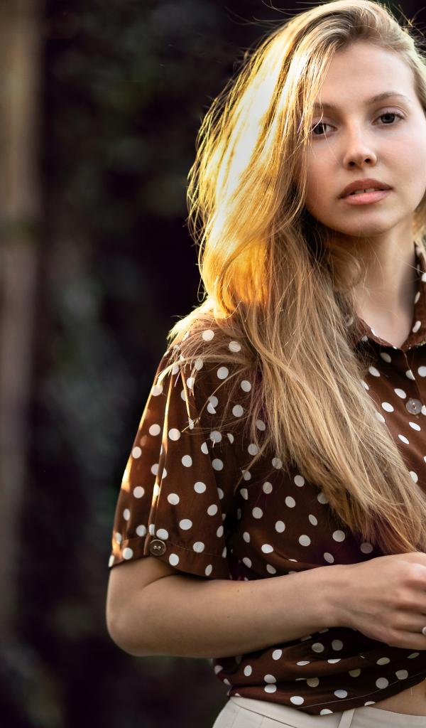 Wallpaper Girl in a shirt in peas with hands in her hair