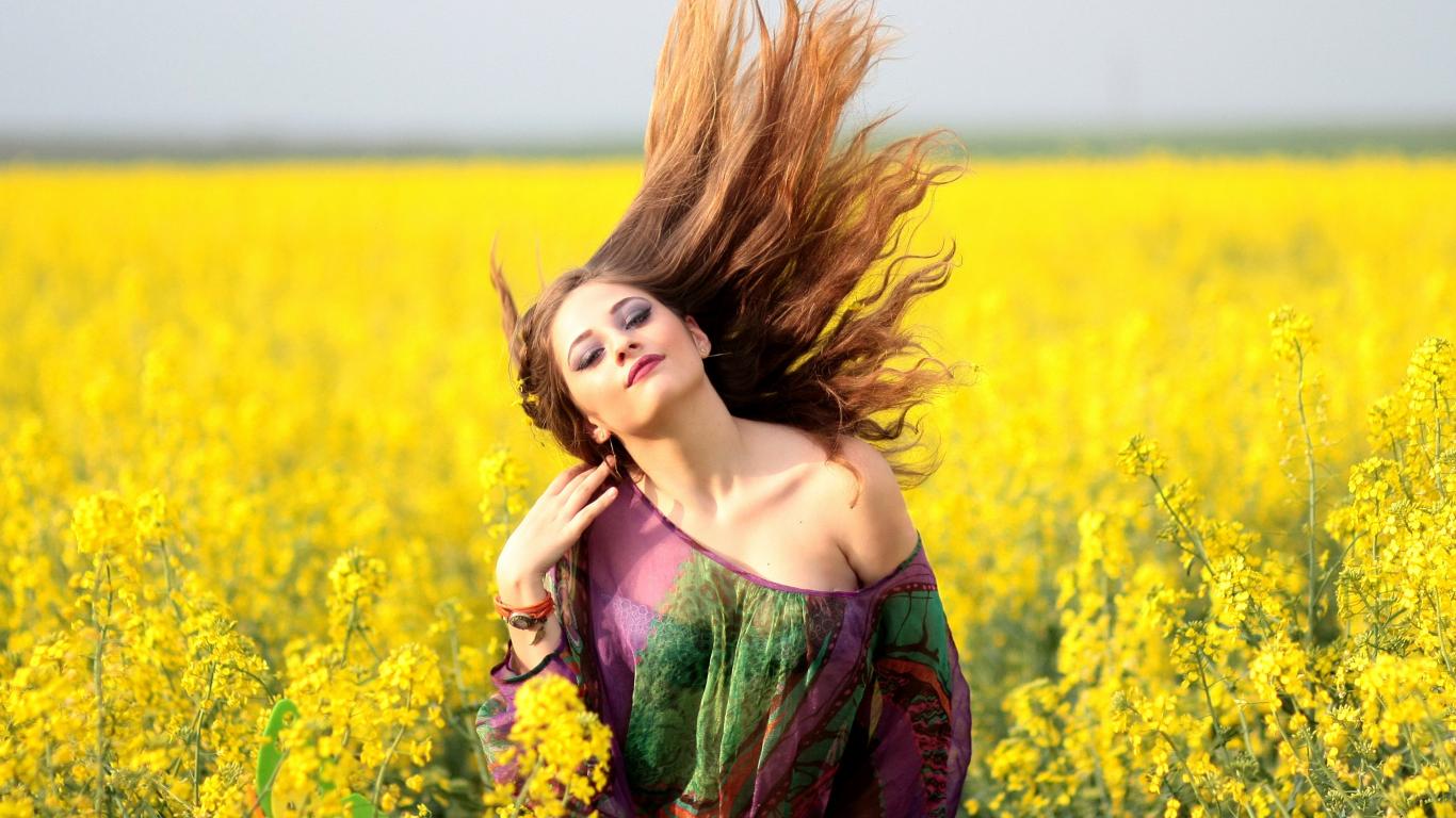 Wallpaper Beautiful girl on the field with yellow flowers