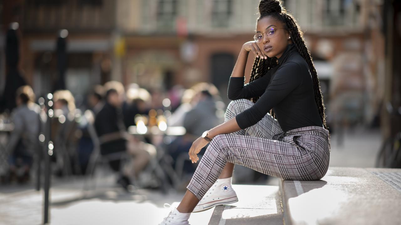 Wallpaper A beautiful dark-skinned girl sitting on the steps