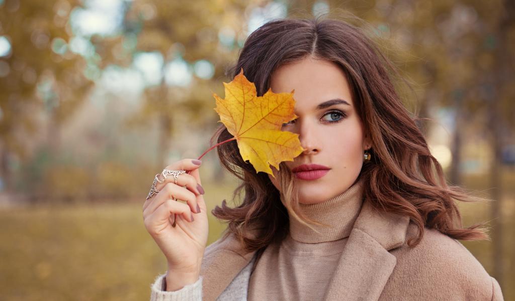 Wallpaper Beautiful girl with an autumn leaf in hand