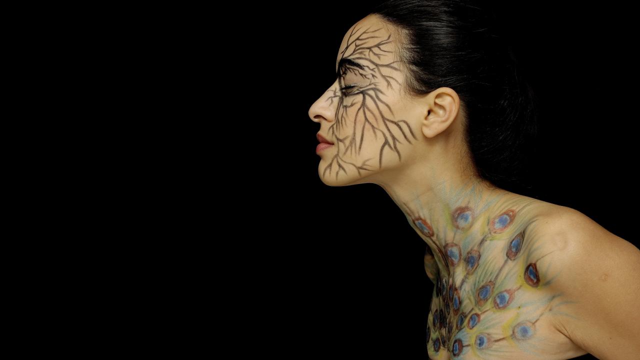 Wallpaper Girl with pictures on the body on a black background