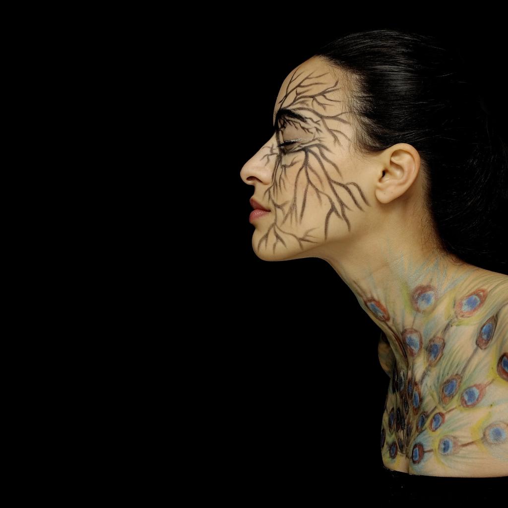 Wallpaper Girl with pictures on the body on a black background