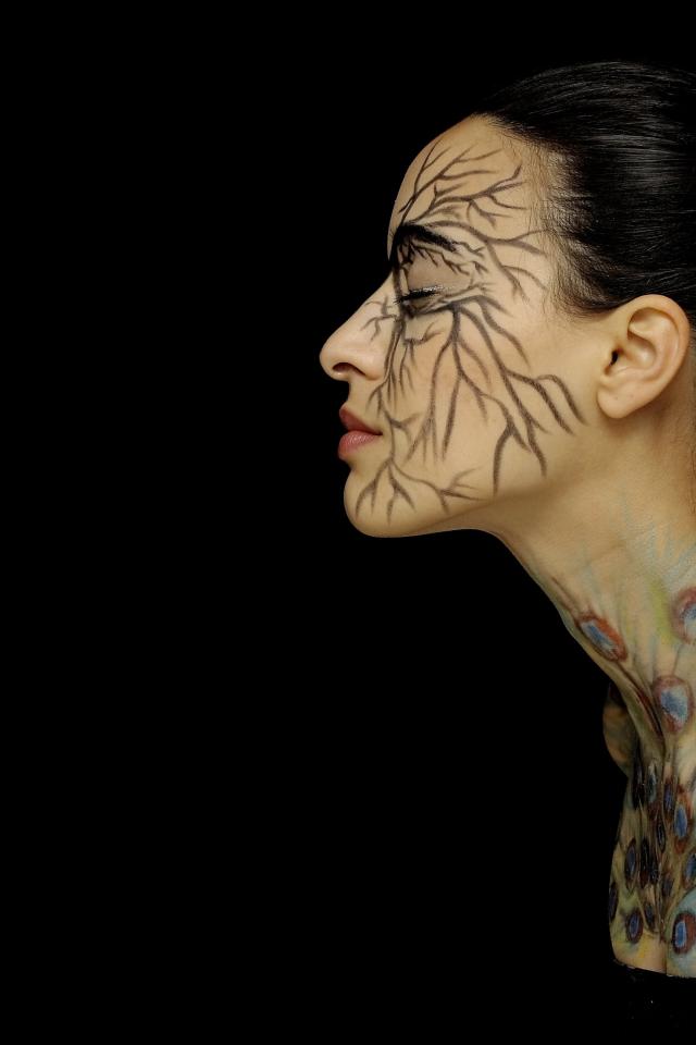 Wallpaper Girl with pictures on the body on a black background