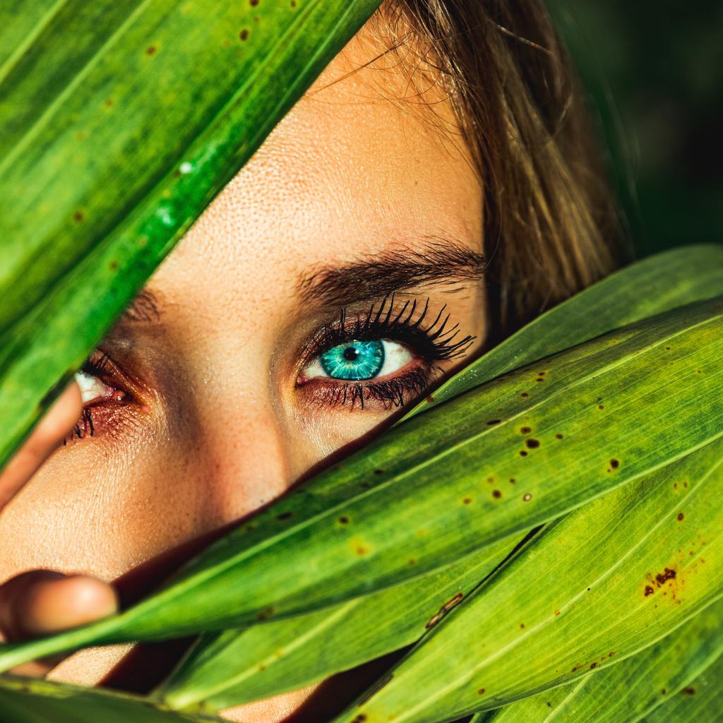 » Wallpaper Girl with blue eyes in green leaves