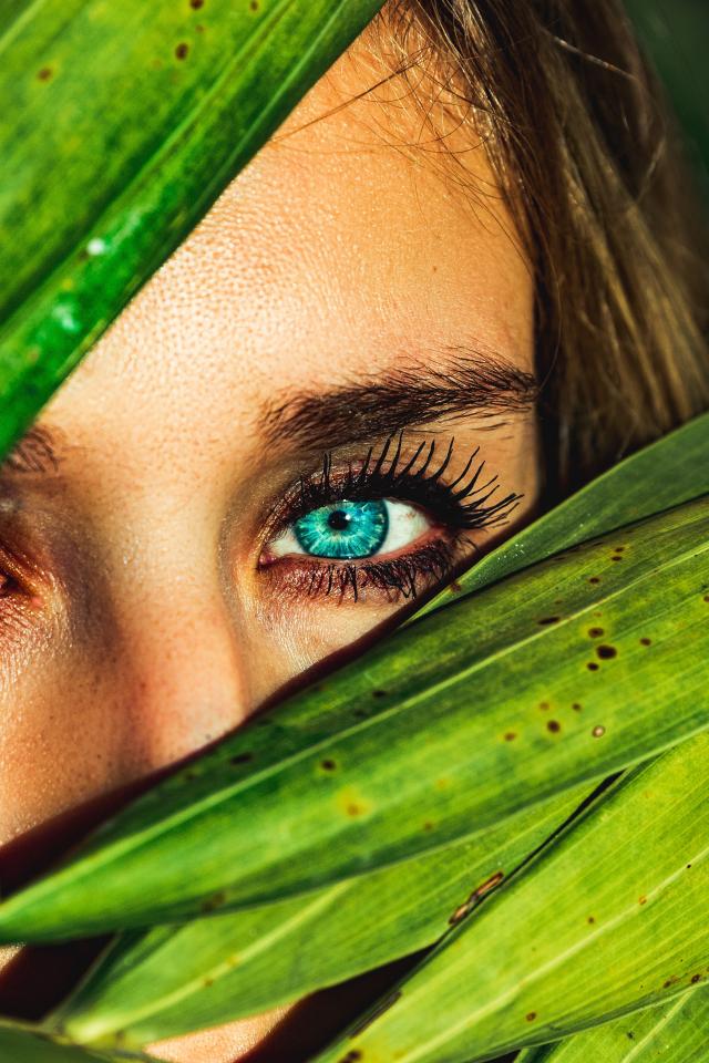 Wallpaper The face of a beautiful blue-eyed girl is decorated with green leaves