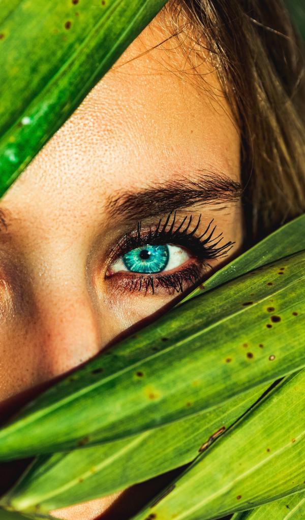 Wallpaper The face of a beautiful blue-eyed girl is decorated with green leaves