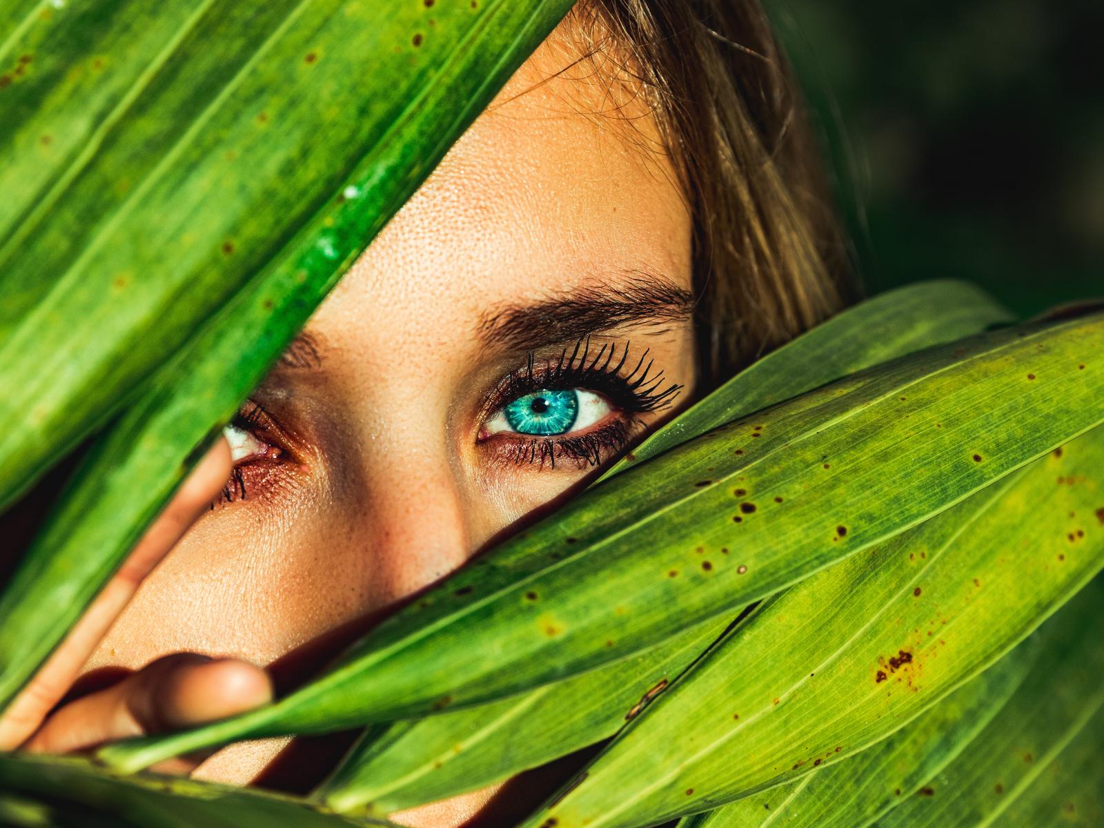 Wallpaper The face of a beautiful blue-eyed girl is decorated with green leaves
