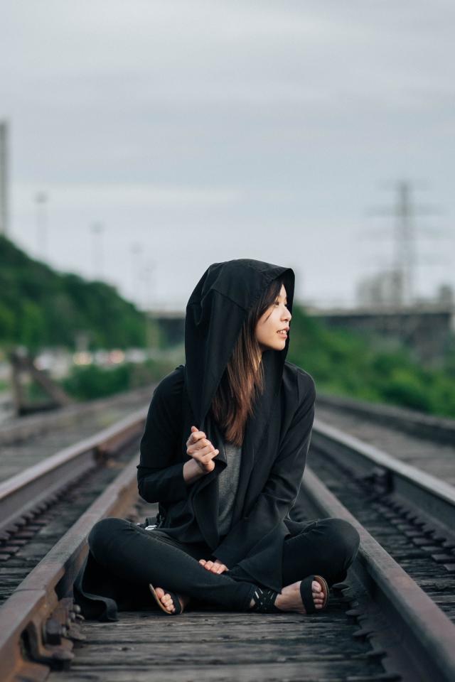 Wallpaper Asian girl in black hoodie sits on the rails