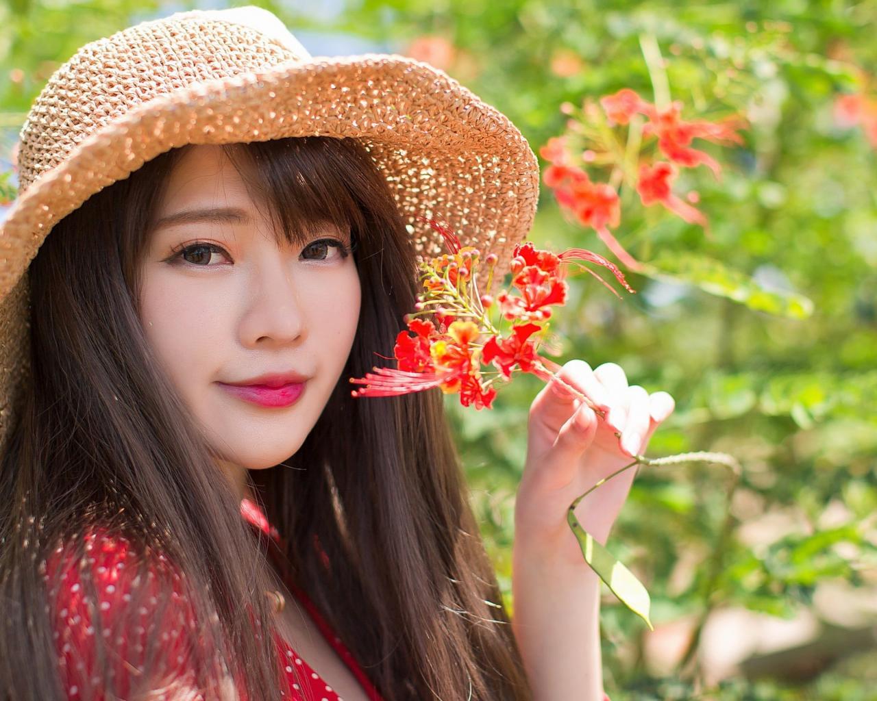 Wallpaper Asian girl in a hat with a red flower