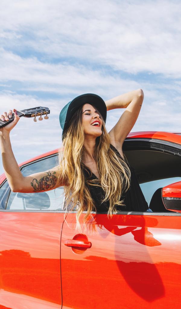 Wallpaper Young girl with a guitar in a red car in summer