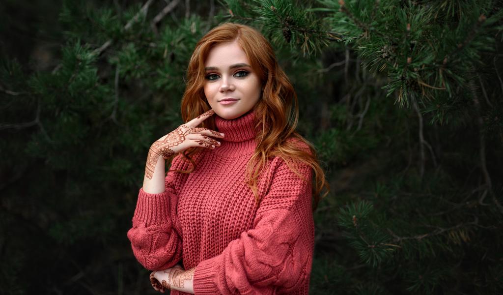 Wallpaper Red-haired girl in a pink sweater stands at the fir