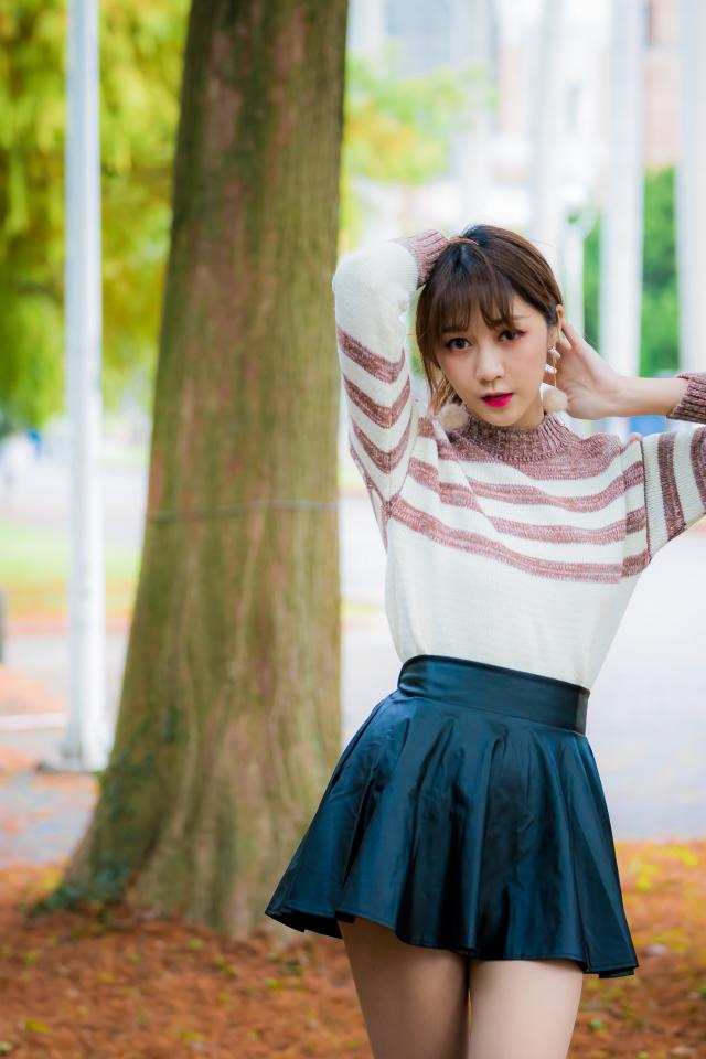 Wallpaper Asian girl standing in a short skirt by the tree