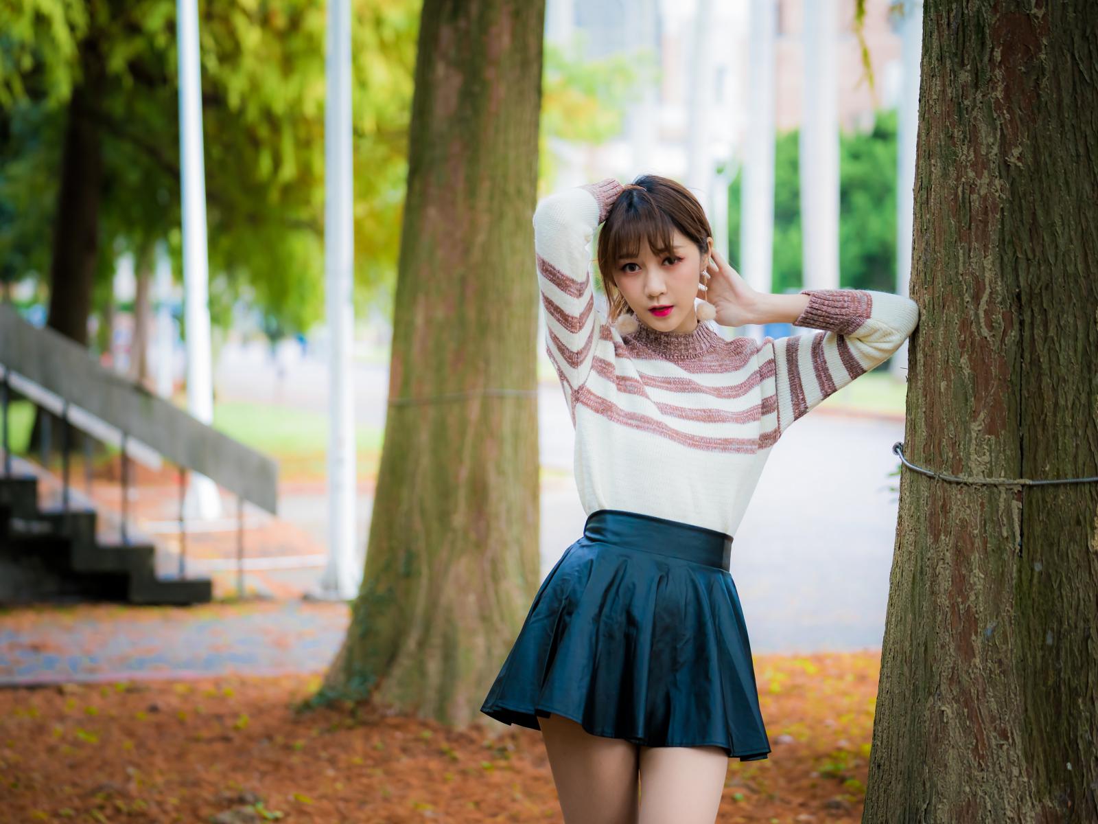 Wallpaper Asian girl standing in a short skirt by the tree
