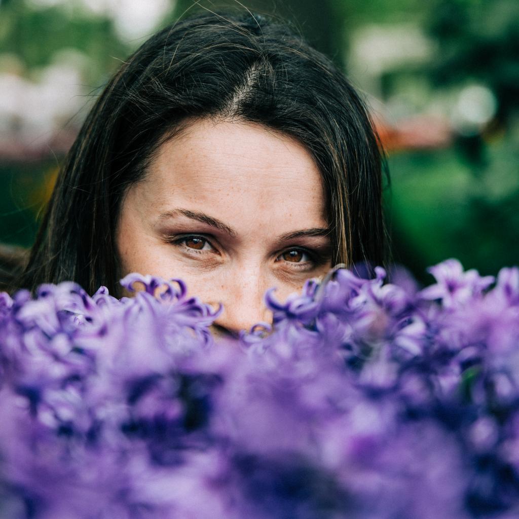 Wallpaper Beautiful brown-eyed brunette with hyacinth flowers