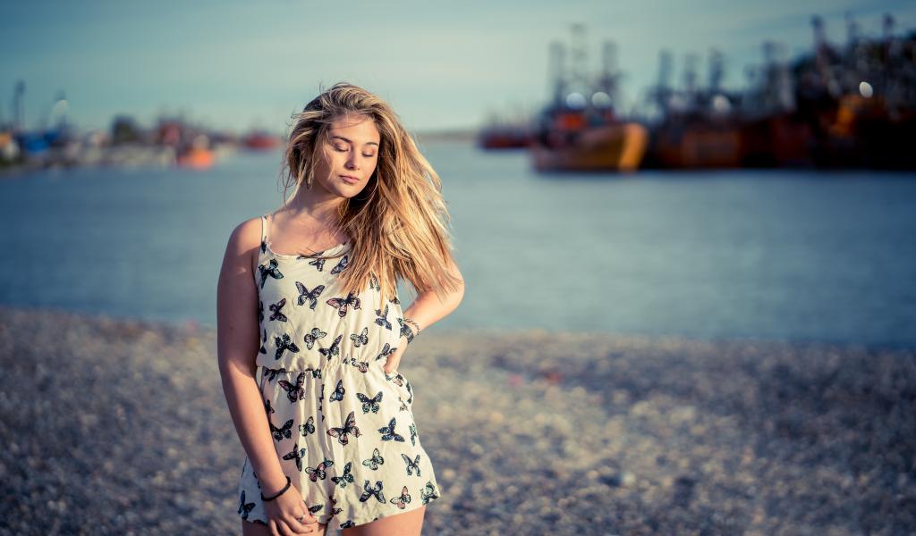 Wallpaper Cute blonde on the background of the sea in the port