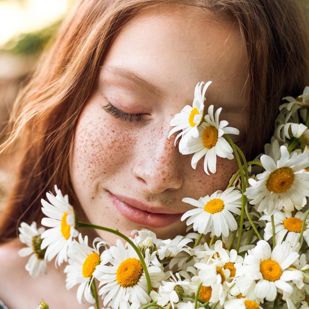 Wallpaper Red-haired girl with a bouquet of daisies