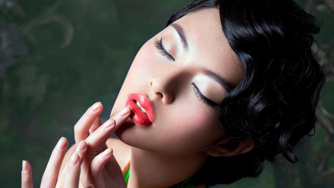 Wallpaper Brunette with closed eyes touches a finger on her lips