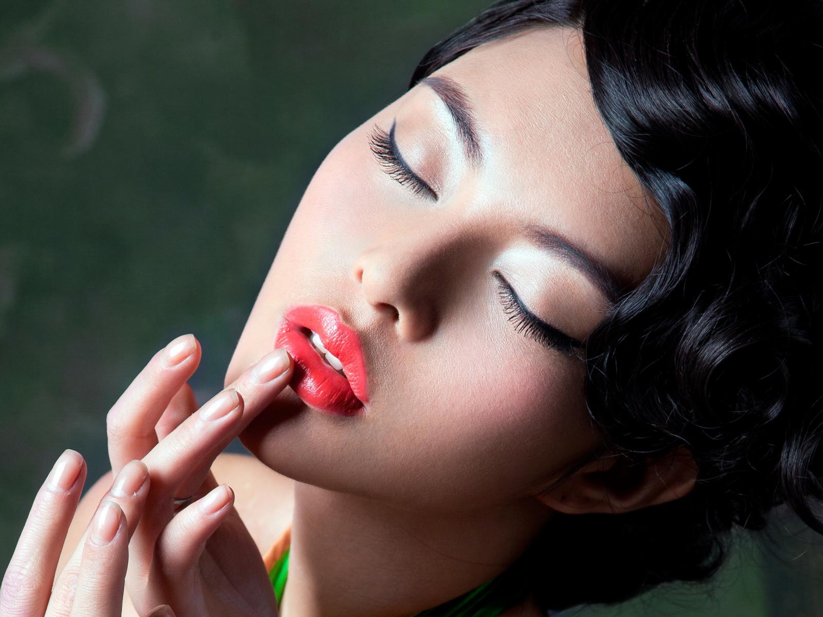 Wallpaper Brunette with closed eyes touches a finger on her lips