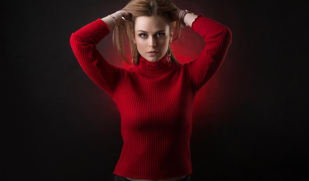 Wallpaper Young girl in a red sweater with hands in her hair