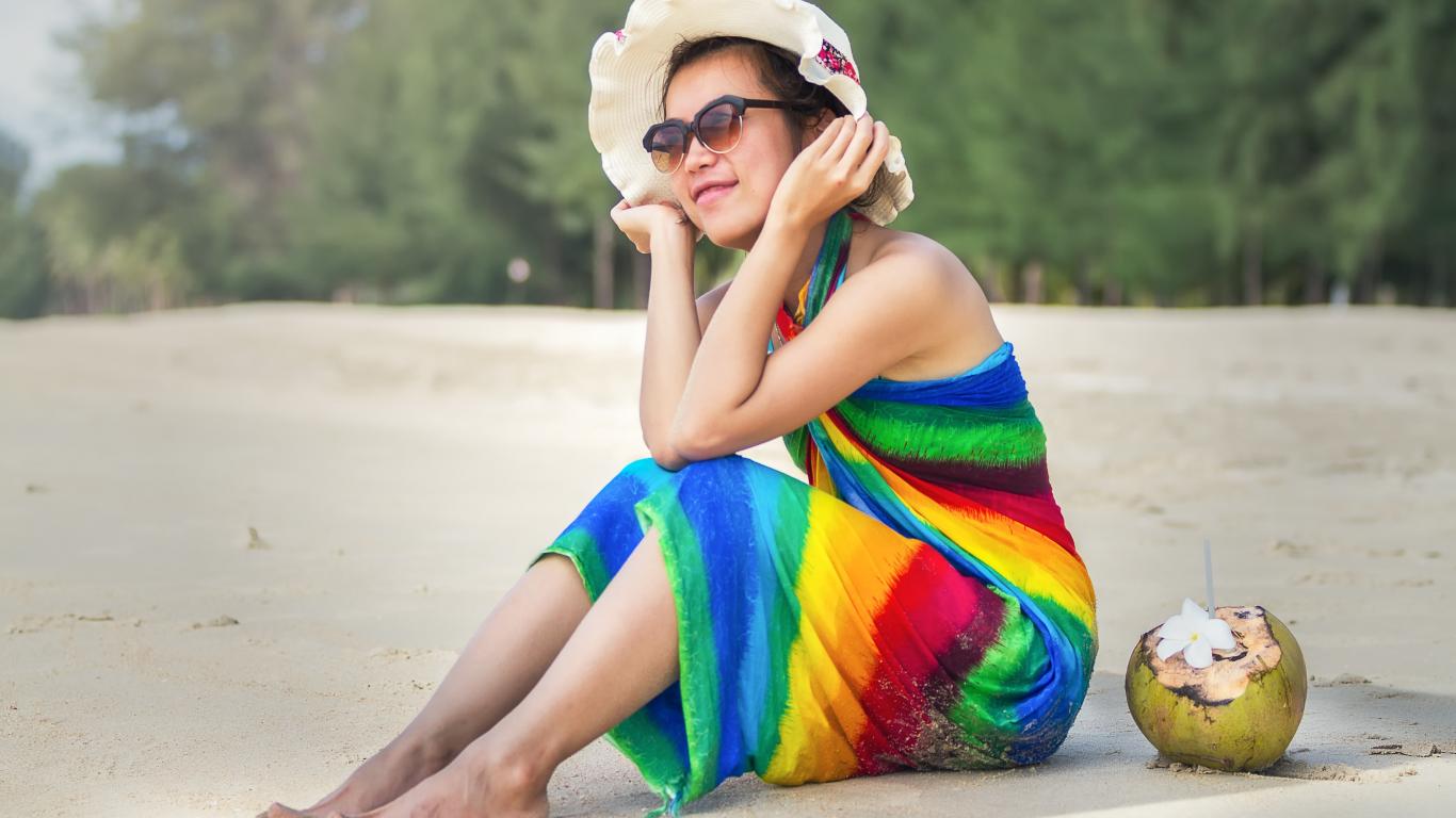 Wallpaper Young Asian woman sitting on the beach with a coconut