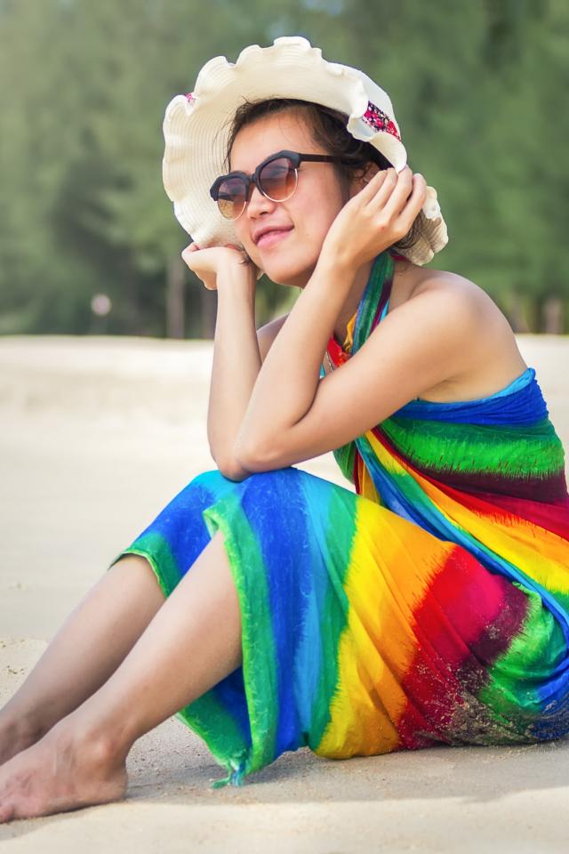 Wallpaper Young Asian woman sitting on the beach with a coconut
