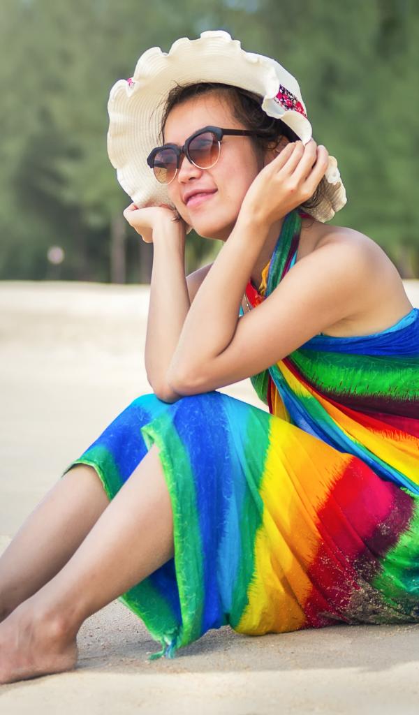 Wallpaper Young Asian woman sitting on the beach with a coconut