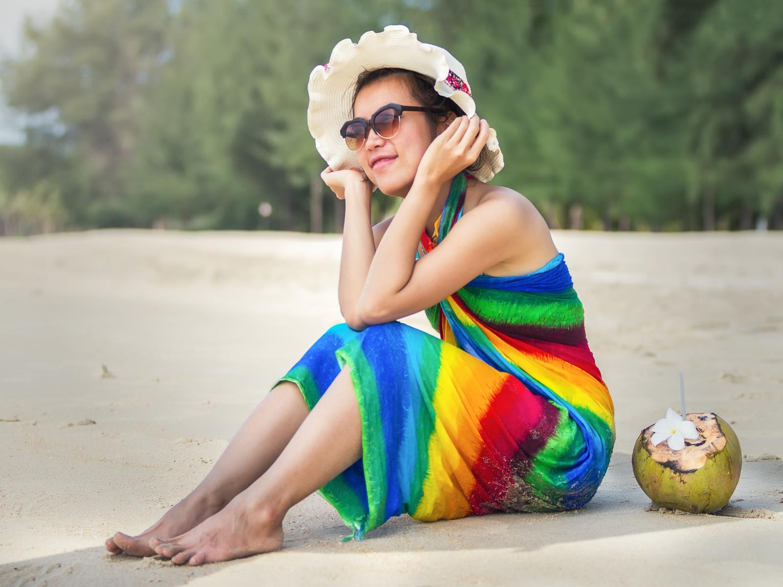 Wallpaper Young Asian woman sitting on the beach with a coconut
