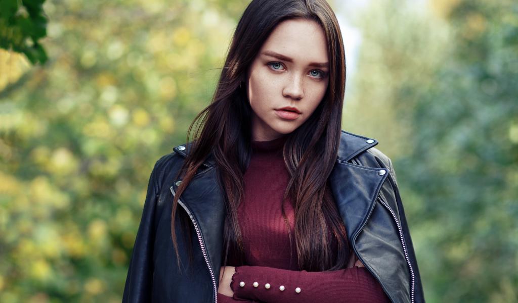 Wallpaper Young blue-eyed brunette in a leather jacket