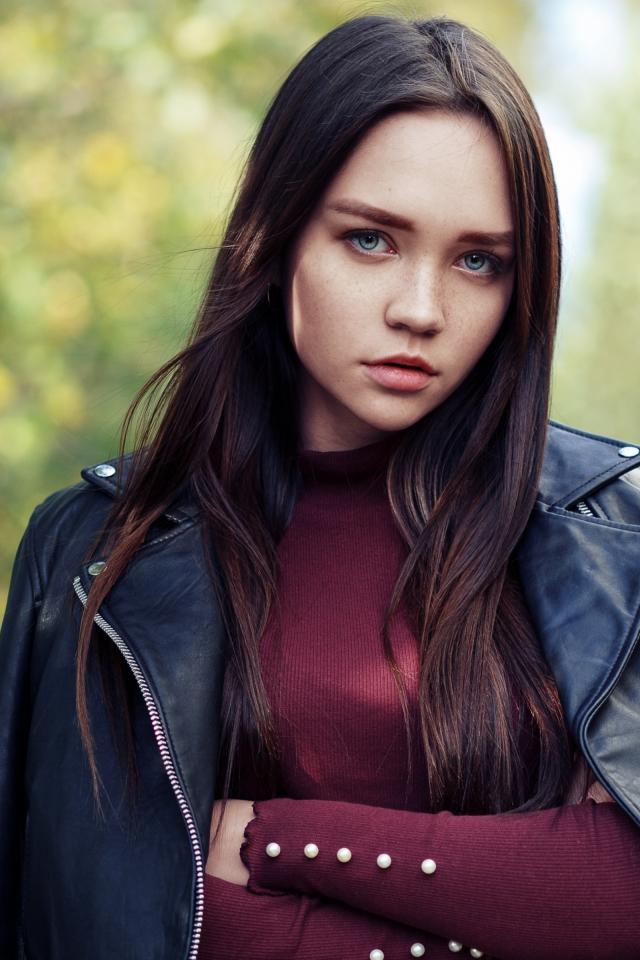 Wallpaper Young blue-eyed brunette in a leather jacket