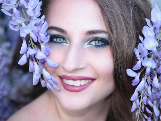 Wallpaper Smiling girl with wisteria flowers