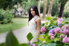 Wallpaper Beautiful Asian woman with a fan in her hands stands by a bush with pink flowers