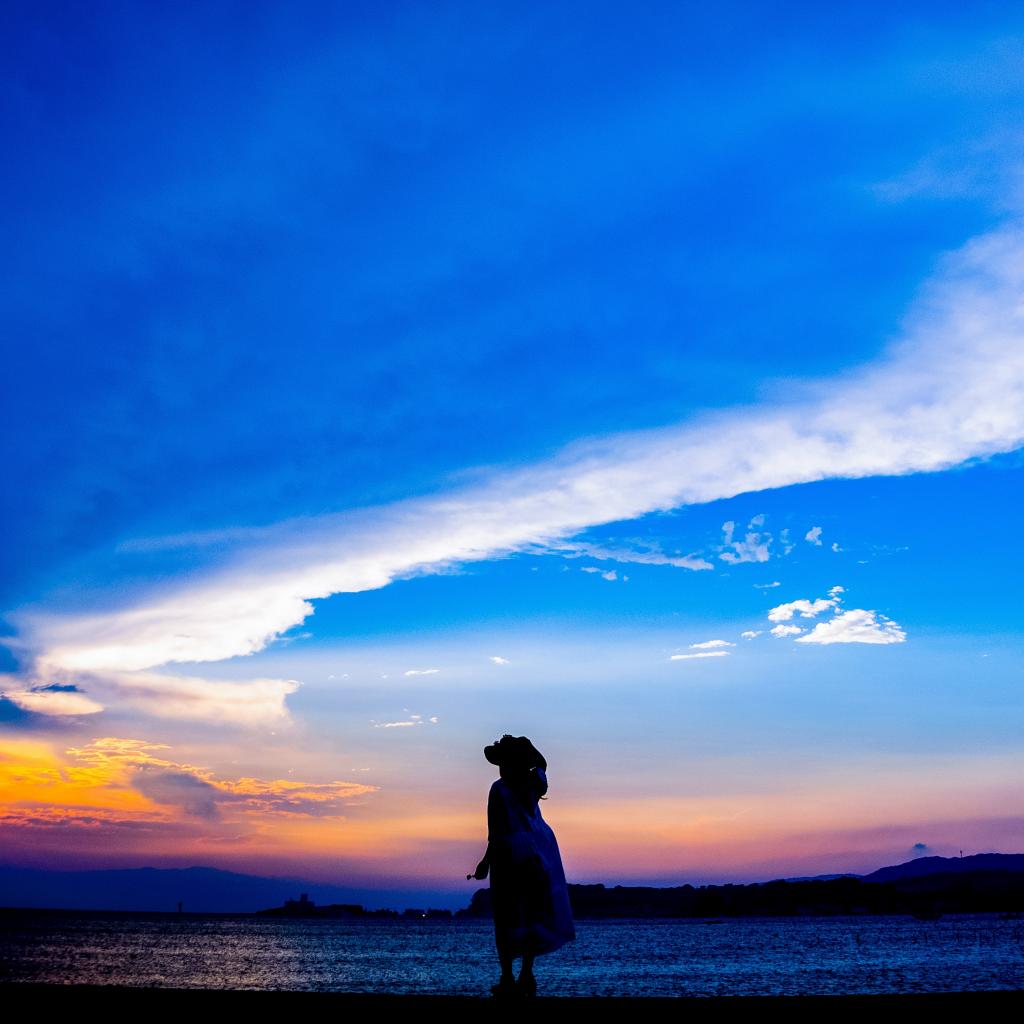 Wallpaper Girl in a hat looks at the sunset on the seashore
