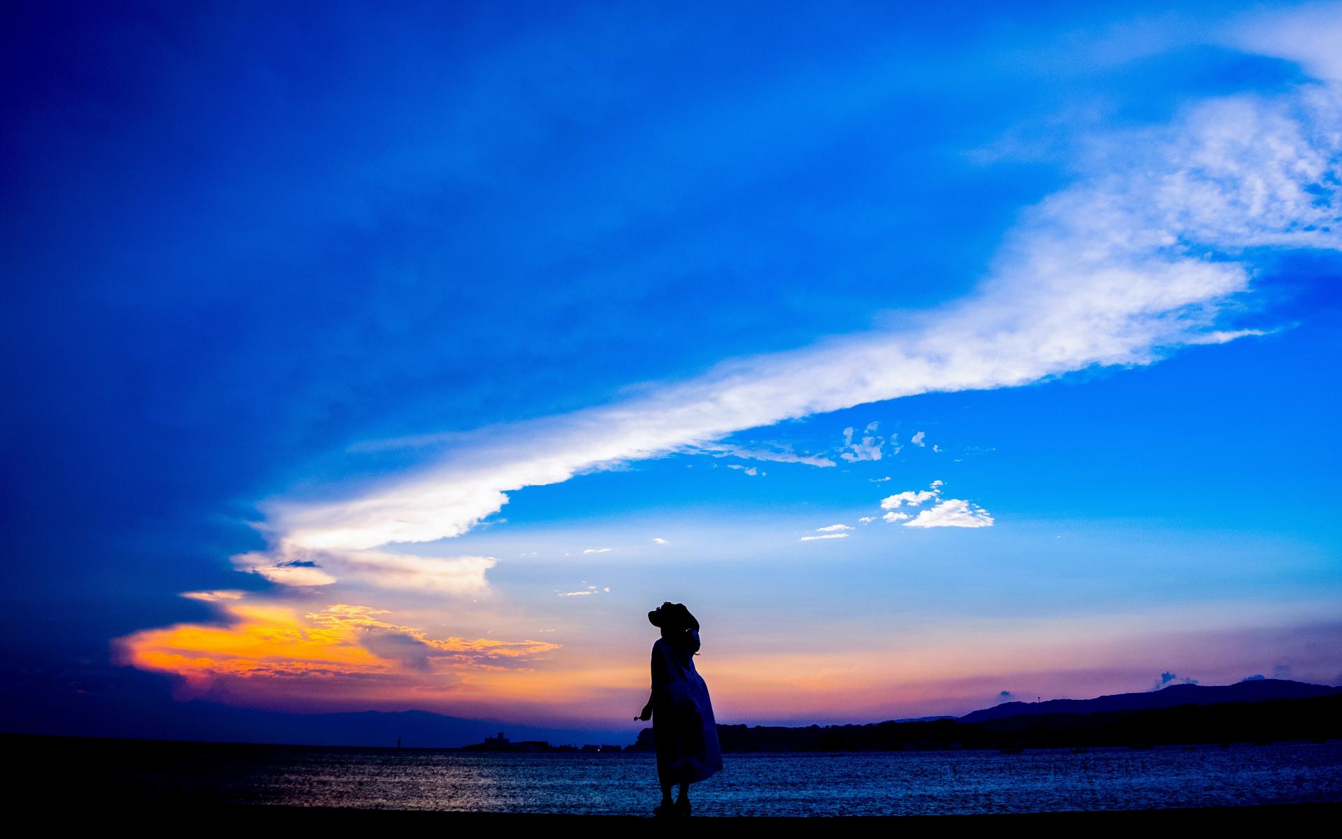 Wallpaper Girl in a hat looks at the sunset on the seashore