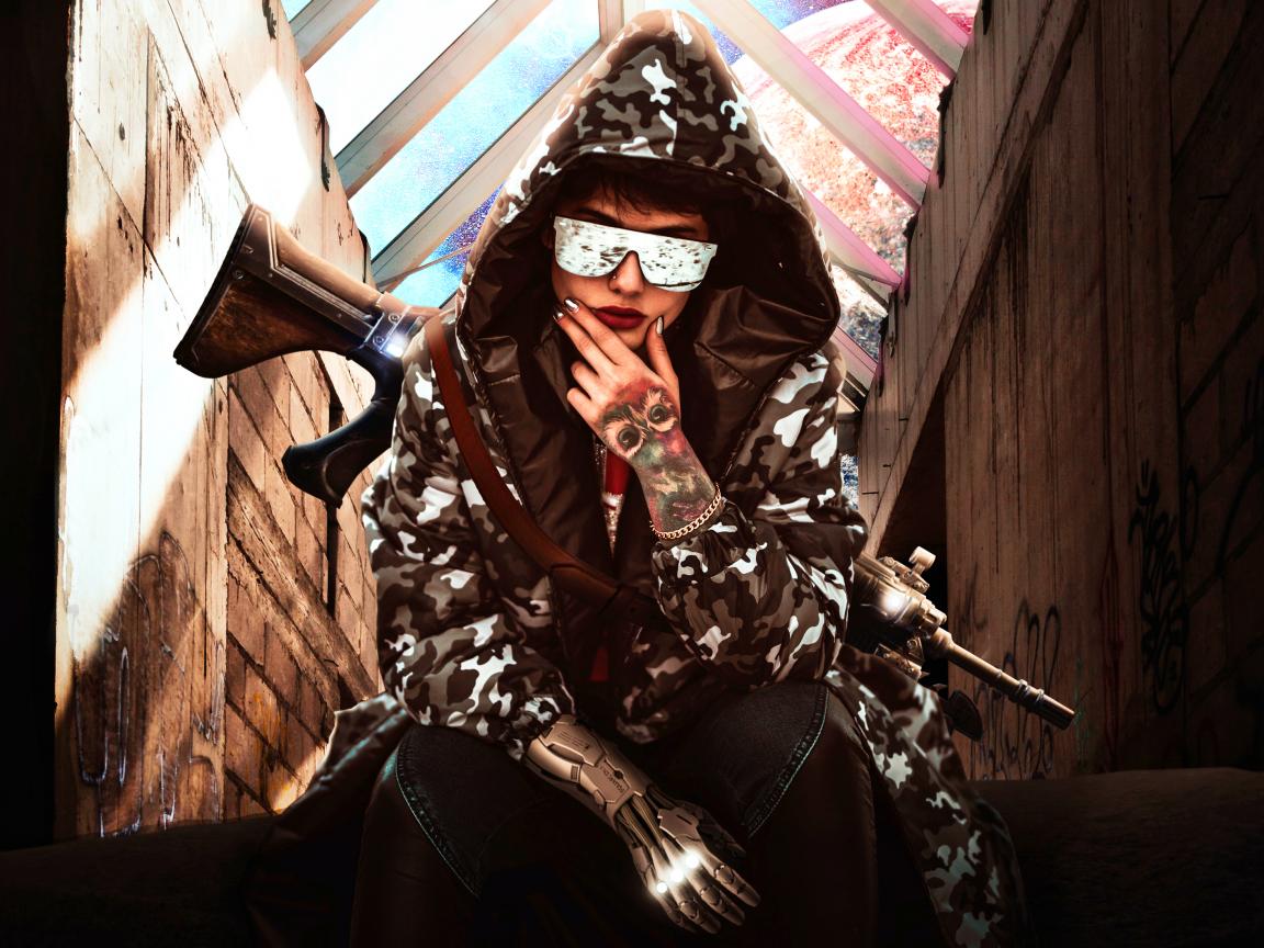 Wallpaper Girl with a gun in a hoodie and glasses