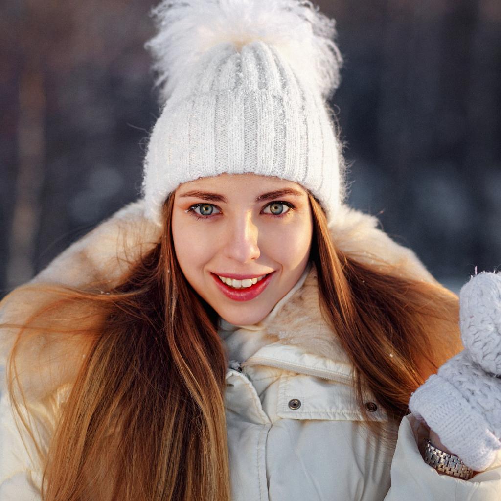 Wallpaper Smiling girl in a warm hat and mittens in winter