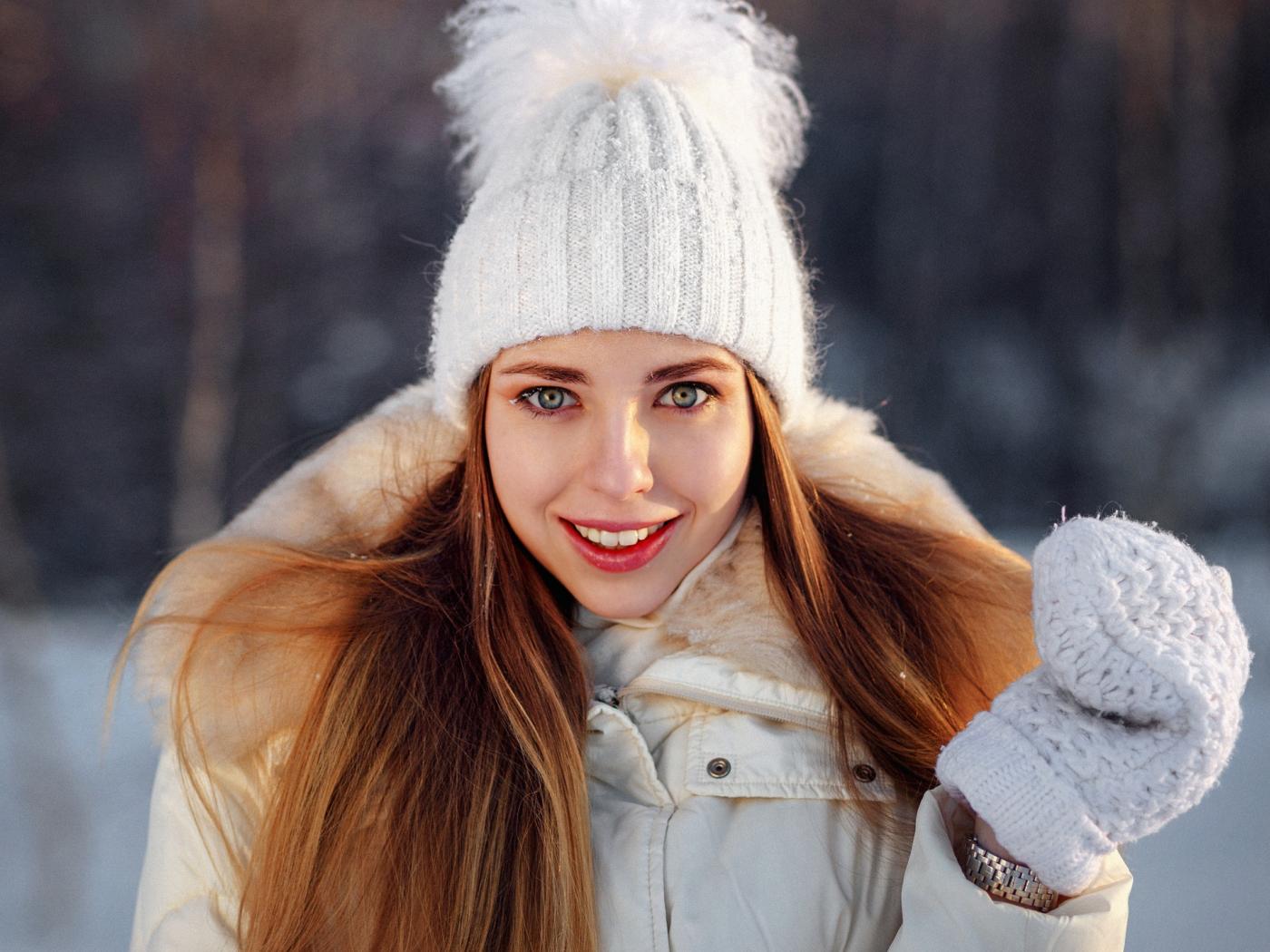 Wallpaper Smiling girl in a warm hat and mittens in winter