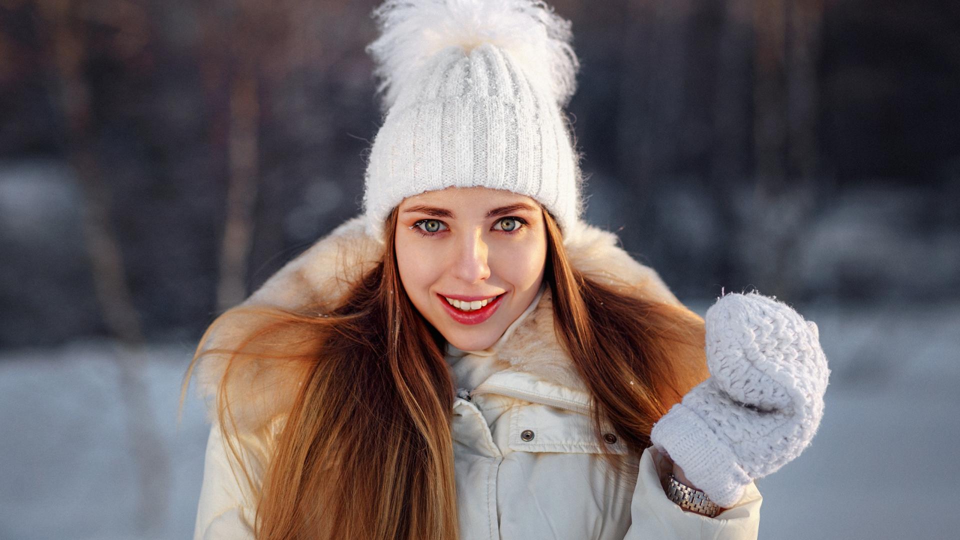 Wallpaper Smiling girl in a warm hat and mittens in winter