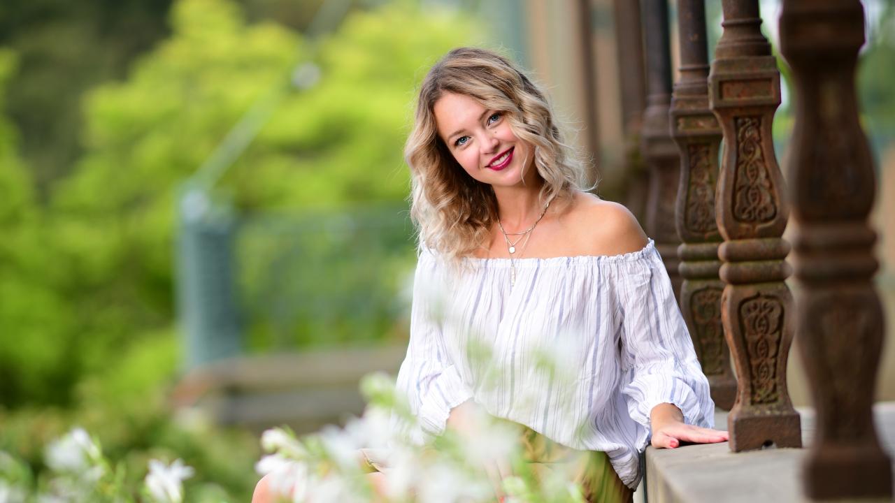 Wallpaper Smiling girl sitting on the steps