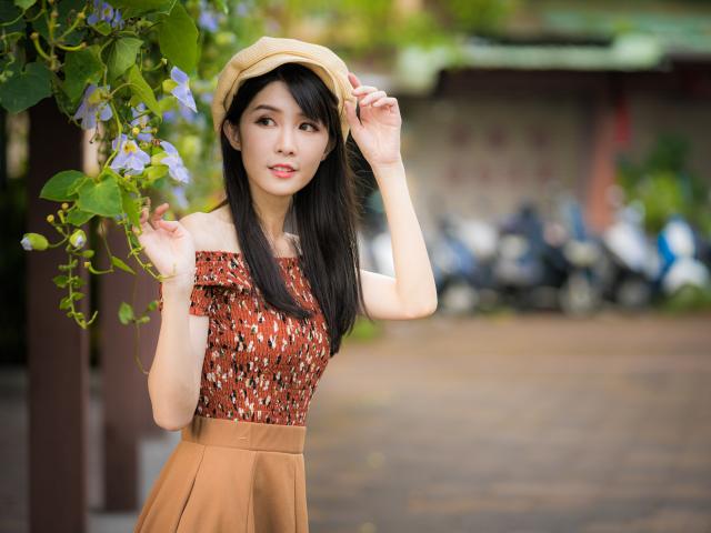 Wallpaper A young Asian girl in a cap stands by the blue flowers