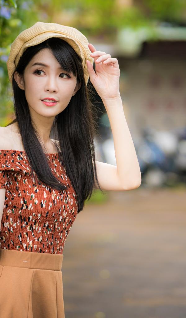 Wallpaper A young Asian girl in a cap stands by the blue flowers