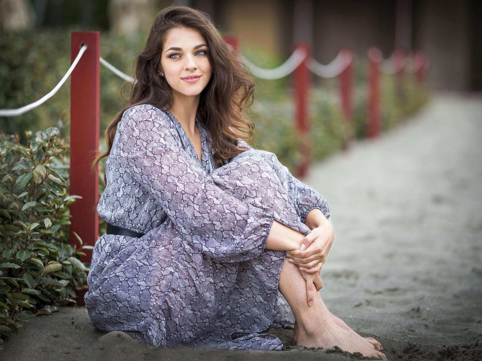 Wallpaper Beautiful girl in a dress sits on the sand