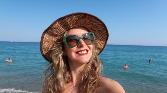 Wallpaper Smiling girl in sunglasses and hat at the sea