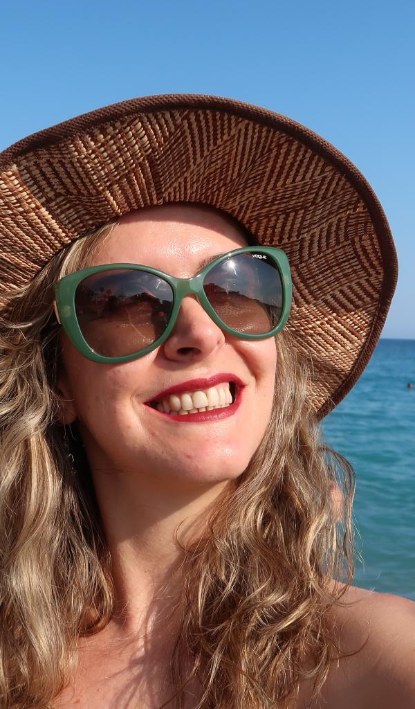 Wallpaper Smiling girl in sunglasses and hat at the sea